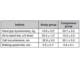 Актуальність. Дослідження саркопенії та артеріальної гіпертензії (АГ) стало підставою припущення про взаємозв’язок дисфункції лівого шлуночка з тяжкістю саркопенії. Мета: вивчити зміни скелетних м’язів та частоту саркопенії у хворих з АГ. Матеріали та методи. Обстежено 180 пацієнтів віком 63,8 ± 6,2 року з АГ ІІ стадії зі збереженою фракцією викиду. 50 % пацієнтів (60 жінок і 30 чоловіків) за анкетою SARC-F мали показник більше 4 балів і становили основну групу, решта — групу порівняння. Для діагностики саркопенії м’язову силу оцінювали за допомогою кистьової динамометрії і тесту «встати зі стільця», м’язову масу — за окружністю гомілки, функцію скелетних м’язів — за тестом оцінки швидкості ходьби. Саркопенію встановлювали на основі критеріїв EWGSOP2 (2019). Результати. В основній групі визначено знижену силу кисті у 88,3 % жінок та 60 % чоловіків, а також збільшений час виконання тесту «встати зі стільця» (25,2 ± 1,2 с/5 разів). Вірогідні кореляційні зв’язки встановлено між показниками кистьової динамометрії та віком жінок (r = –0,53; р < 0,05) і чоловіків (r = –0,18; р < 0,05), а також індексом маси тіла (ІМТ) (r = –0,77; р < 0,05 у жінок і r = –0,88; р < 0,05 у чоловіків). У 58,3 % жінок і 33,3 % чоловіків відмiчено зменшення окружності гомілки < 31 см. Виявлено кореляційні зв’язки між ІМТ та окружністю гомілки в жінок (r = 0,87, р < 0,05) та чоловіків (r = 0,41; р < 0,05). Зниження функції скелетних м’язів відмічали в 53,3 % жінок і 23,3 % чоловіків. Вірогідні кореляційні зв’язки встановлено між швидкістю ходи та віком жінок (r = –0,41; р < 0,05) і чоловіків (r = –0,35; р < 0,05), а також ІМТ (r = –0,46; р < 0,05 у жінок і r = –0,39; р < 0,05 у чоловіків). Висновки. Поширеність саркопенії в когорті хворих на АГ ІІ стадії становить 38,3 %. У досліджуваній групі саркопенія виявлена в 70 % осіб, тяжка її форма — у 35,6 %. Незважаючи на те, що загальна оцінка за шкалою SARC-F у групі порівняння не перевищувала 4 бали, саркопенія була діагностована в 14,4 % випадків.