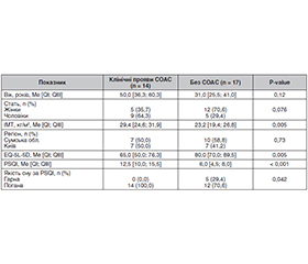 Актуальність. Порушення сну є поширеною проблемою серед дорослого населення, зокрема серед пацієнтів із синдромом обструктивного апное сну (СОАС). Ці розлади розглядаються як одні з найсерйозніших клінічних станів, що призводять до істотного погіршення життєвого прогнозу та якості життя. Недосипання, циркадне зміщення, СОАС поширені в популяції. Встановлено також несприятливі кардіометаболічні та репродуктивні наслідки порушень сну. Мета дослідження: оцінити взаємозв’язок між якістю сну (за PSQI) та якістю життя/станом здоров’я (за EQ-5D-5L) у дорослих пацієнтів та визначити, чи асоціюється гірша якість сну з нижчими індексами EQ-5D-5L і шкалою EQ-VAS. Матеріали та методи. У дослідження включено 31 пацієнта, яких було розподілено на дві групи залежно від регіону проведення опитування: І група — Сумська область, ІІ група — м. Київ. Вік пацієнтів перебував у межах від 16 до 70 років (у середньому 38,0 [29,0; 52,0] року). Результати. Середній бал за опитувальником EQ-5D-5L серед всіх пацієнтів становив 70,00 [60,00; 85,00] (мінімум — 10, максимум — 90), а PSQI — 9,00 [6,00; 12,00] (мінімум — 3, максимум — 17). Статистично значущі відмінності між групами дослідження спостерігали лише в категорії «Біль», р = 0,028, за рахунок того, що відповідь з оцінкою в 1 бал частіше надавали респонденти з Києва, ніж із Сумської області, р < 0,05. При порівнянні частот варіантів відповідей в групі І (Сумська область) встановлено статистично значущі відмінності за всіма категоріями запитань. Показник анкетування «Гарна якість сну» асоціюється з балами за EQ-5D-5L щонайменше 60 і вище. Багатофакторний регресійний аналіз показав, що найбільший вплив на оцінку якості здоров’я за EQ-5L-5D у всіх респондентів мав ІМТ (adjR2 = 0,26, p = 0,002). Висновки. Частота виявлення СОАС у респондентів була статистично значуще однаковою як у Сумській області, так і в Києві (p > 0,05). При цьому особи з/без СОАС вірогідно не відрізнялись за статтю і віком (p > 0,05). У пацієнтів з клінічними проявами СОАС середній бал за EQ-5L-5D був статистично значуще нижчим, ніж без СОАС, і перебував у діапазоні від 10 до 85 балів (р = 0,005). Водночас середні значення балів за PSQI були статистично значуще вищими (мінімально — 9, максимально — 17) у пацієнтів з СОАС порівняно з відсутністю ознак СОАС (р < 0,001). У всіх пацієнтів з СОАС якість сну відповідала показнику «Погана якість сну».